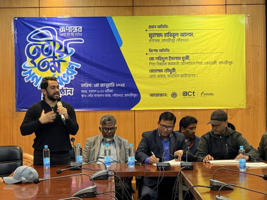 On January 2nd, Rupantor ICT Lab celebrated the culmination of hard work and dedication with a special gathering for the September-December 2024 semester graduates at the Municipality Hall in Madaripur. The event saw the participation of approximately 150 students, esteemed guests from the municipality, the District Children’s Affairs Officer, and a board member from the Sanabil Foundation USA. As a co-founder of ACT Foundation, it was heartwarming to witness the fruits of our collaborative efforts.